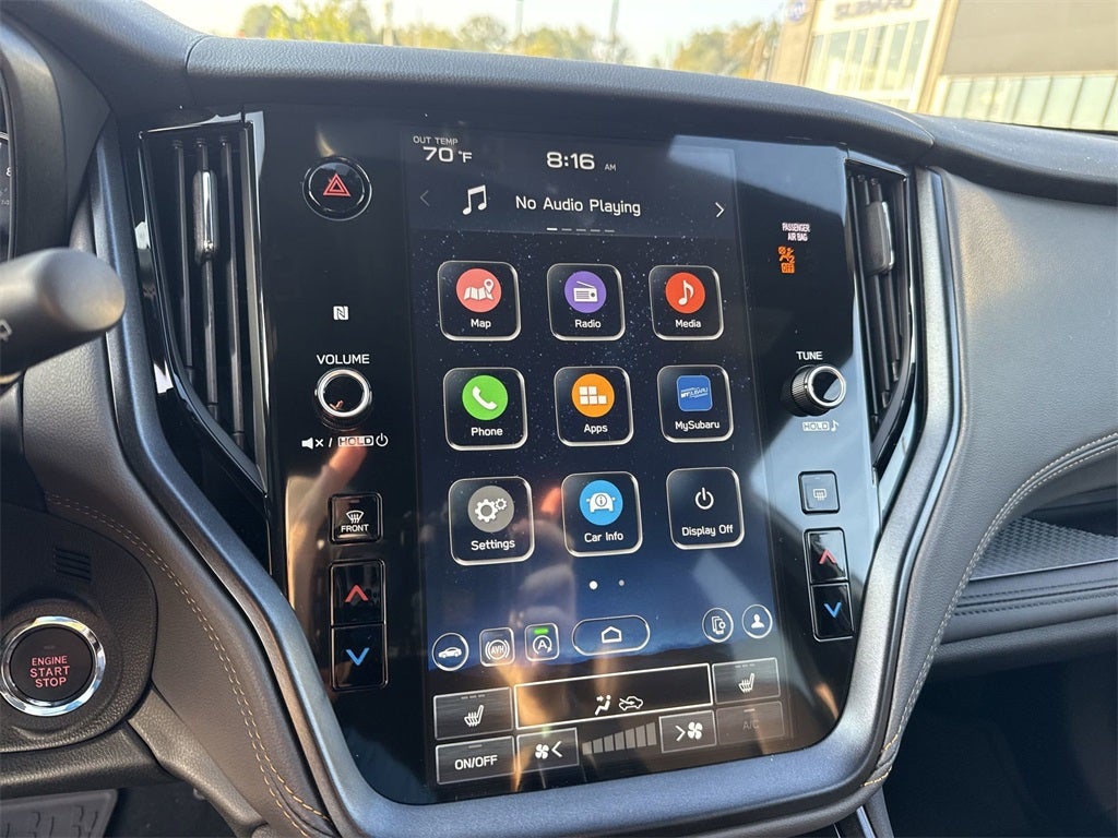Power Moonroof & Navigation & RAB (Power Moonroof, Radio: Subaru 11.6 Multimedia System w/Navigation, and Reverse Automatic Braking (RAB) System), 12 Speakers, 4-Wheel Disc Brakes, ABS brakes, Air Conditioning, Alloy wheels, AM/FM radio: SiriusXM with 360L, Apple CarPlay & Android Auto, Auto High-beam Headlights, Auto-dimming Rear-View mirror, Automatic temperature control, Brake assist, Compass, Door Projector Light, Driver door bin, Driver vanity mirror, Dual front impact airbags, Dual front side impact airbags, Electronic Stability Control, Emergency communication system: MySubaru Safety (3-year free trial), Exterior Parking Camera Rear, Four wheel independent suspension, Front anti-roll bar, Front Bucket Seats, Front Center Armrest w/Storage, Front dual zone A/C, Front fog lights, Front reading lights, Fully automatic headlights, Garage door transmitter: HomeLink, harman/kardon® Speakers, Heated door mirrors, Heated Front Bucket Seats, Heated front seats, Heated rear seats, Heated steering wheel, Illuminated entry, Knee airbag, Leather steering wheel, LED Upgrade, Low tire pressure warning, Occupant sensing airbag, Outside temperature display, Overhead airbag, Overhead console, Panic alarm, Passenger door bin, Passenger vanity mirror, Power door mirrors, Power driver seat, Power Liftgate, Power passenger seat, Power steering, Power windows, Radio: Subaru 11.6 Multimedia Plus System, Rear anti-roll bar, Rear seat center armrest, Rear window defroster, Rear window wiper, Remote keyless entry, Roof rack, Security system, Speed control, Speed-sensing steering, Splash Guards, Split folding rear seat, Spoiler, StarTex-Trimmed Upholstery, Steering wheel mounted audio controls, Tachometer, Telescoping steering wheel, Tilt steering wheel, Traction control, Trip computer, Turn signal indicator mirrors, USB Charging Cable Set, Variably intermittent wipers, Wheels: 17 x 7J Matte Black Aluminum-Alloy, and Wireless Charger.