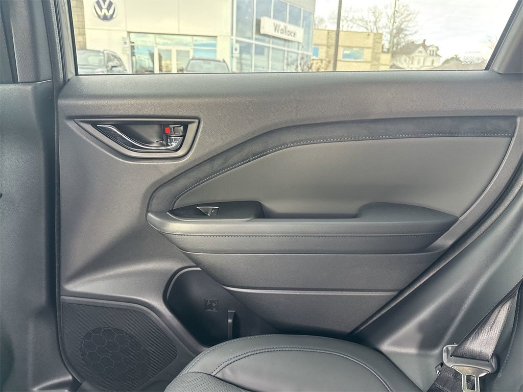 4-Wheel Disc Brakes, 6 Speakers, ABS brakes, Air Conditioning, Alloy wheels, AM/FM radio: SiriusXM with 360L, Anti-whiplash front head restraints, Auto High-beam Headlights, Automatic temperature control, Brake assist, Bumpers: body-color, Driver door bin, Driver vanity mirror, Dual front impact airbags, Dual front side impact airbags, Electronic Stability Control, Emergency communication system: MySubaru Companion (5-years free), Exterior Parking Camera Rear, Four wheel independent suspension, Front anti-roll bar, Front Bucket Seats, Front Center Armrest, Front dual zone A/C, Front fog lights, Front reading lights, Fully automatic headlights, Heated door mirrors, Heated Front Bucket Seats, Heated front seats, Heated steering wheel, Illuminated entry, Knee airbag, Leather steering wheel, Low tire pressure warning, Occupant sensing airbag, Outside temperature display, Overhead airbag, Overhead console, Panic alarm, Passenger door bin, Passenger vanity mirror, Perforated Leather-Trimmed Upholstery, Power door mirrors, Power driver seat, Power Liftgate, Power moonroof: Panoramic, Power passenger seat, Power steering, Power windows, Radio data system, Radio: Subaru 11.6 Multimedia Plus System, Rain sensing wipers, Rear anti-roll bar, Rear seat center armrest, Rear window defroster, Rear window wiper, Remote keyless entry, Security system, Speed control, Speed-sensing steering, Split folding rear seat, Spoiler, Steering wheel mounted audio controls, Tachometer, Telescoping steering wheel, Tilt steering wheel, Traction control, Trip computer, Turn signal indicator mirrors, Variably intermittent wipers, and Wheels: 18 x 7.0 J Dark Metallic Aluminum-Alloy.
